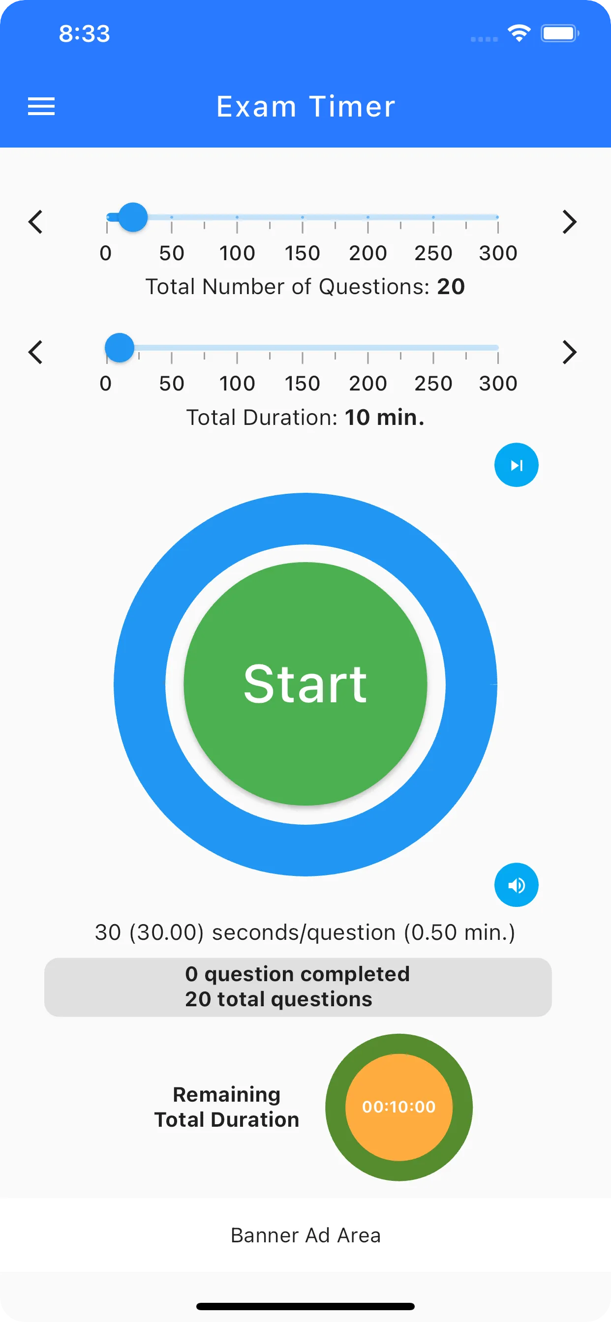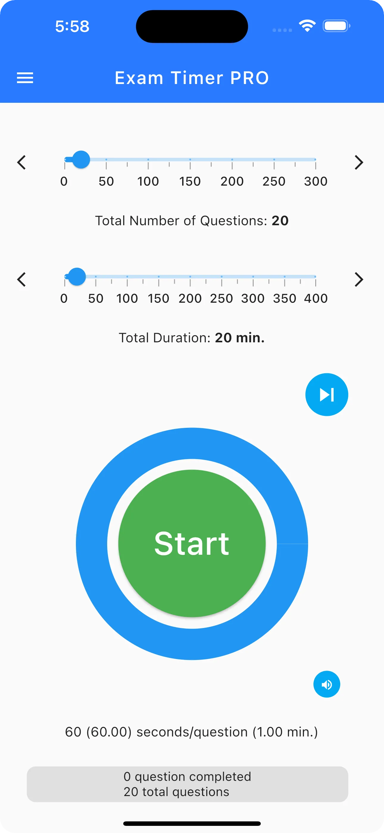 Simply, select the total number of questions and the total time. The application calculates the amount of time per question.
