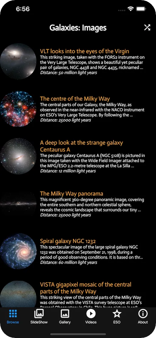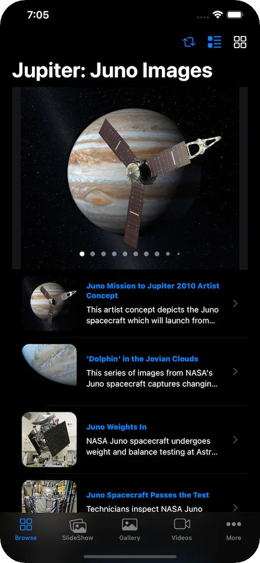 - In the "SlideShow" section, you will be able to browse through hundreds of impressive photos in full screen size and feel as if you were in Jupiter orbit at that moment. If you wish, you will be able to get detailed information about these impressive sights by tapping the Info button.