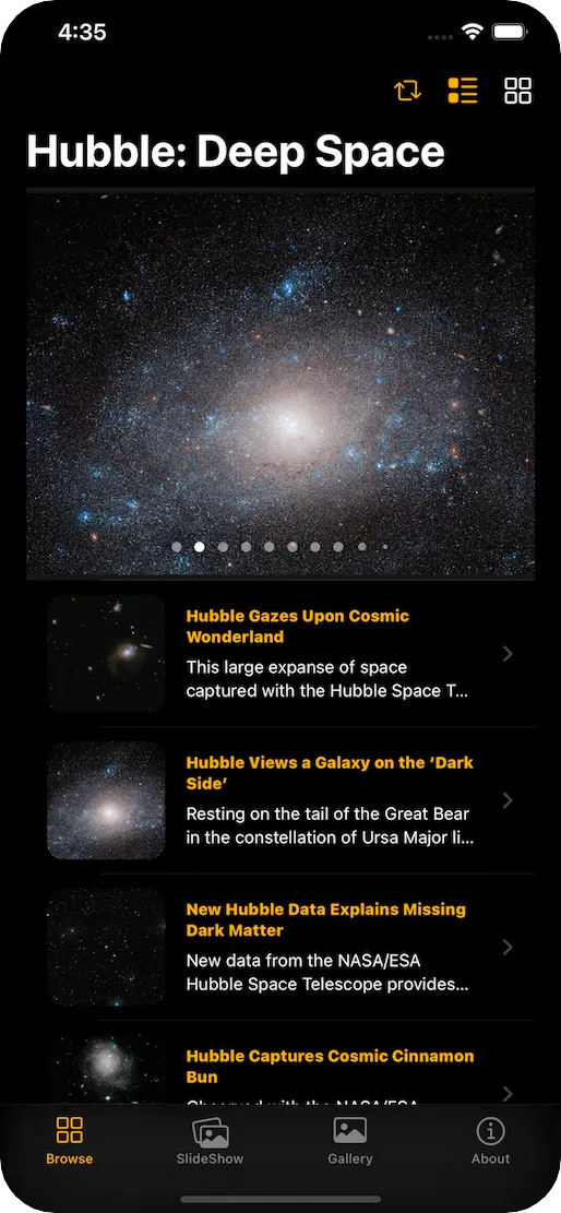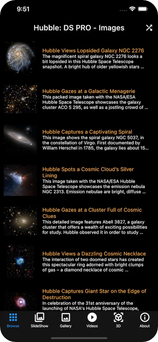You will have a nice user experience and obtain detailed information while navigating through the beautiful photos taken by Hubble Space Telescope.