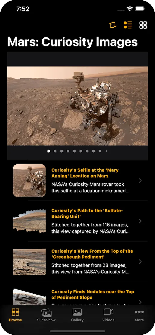 - In the "SlideShow" section, you will be able to browse through hundreds of impressive photos in full screen size and feel as if you were on Mars at that moment. If you wish, you will be able to get detailed information about these impressive sights by tapping the Info button.