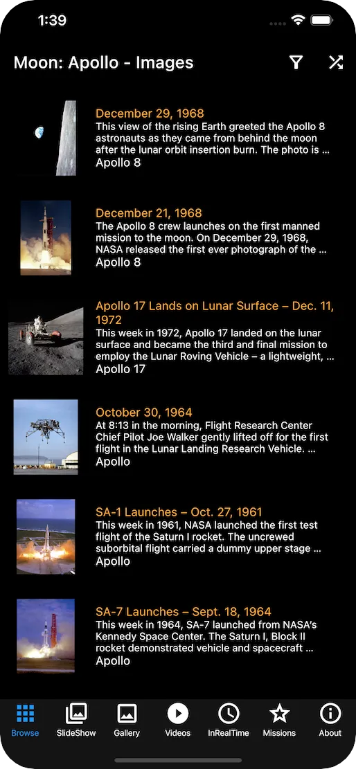 You will have a nice user experience and obtain detailed information while navigating through the beautiful photos taken by the Apollo Missions.