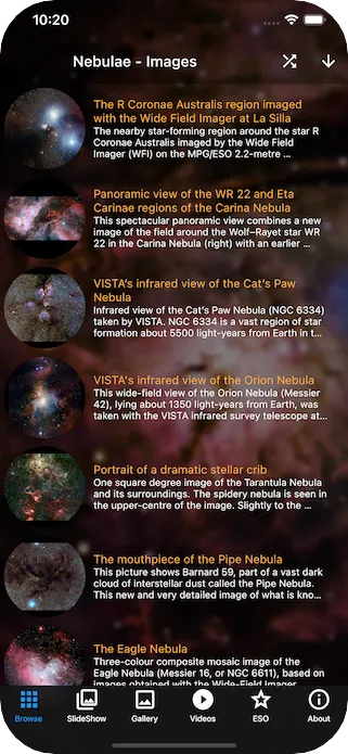 - In the "SlideShow" section, you will be able to browse through hundreds of impressive photos in full-screen size and feel as if you were in the Earth's orbit at that moment. If you wish, you will be able to get detailed information about these impressive sights by tapping the Info button. Additionally, you can start auto-play by tapped the Play button on the top right.