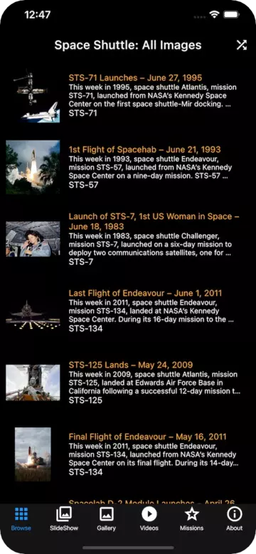 You will have a nice user experience and obtain detailed information while navigating through the beautiful photos taken by the Space Shuttle Missions.
